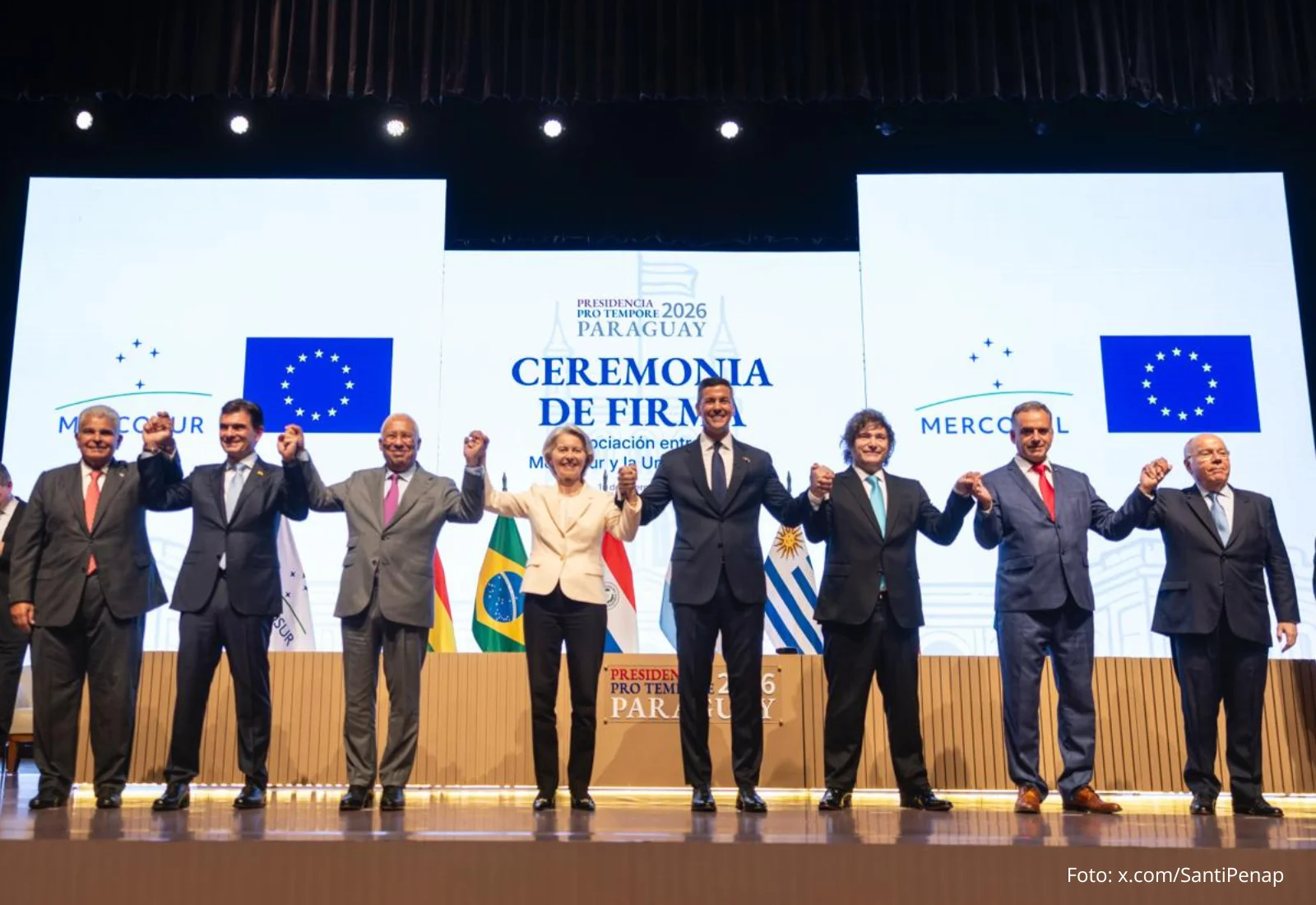 El Mercado Común del Sur (MERCOSUR) y la Unión Europea concretaron este sábado 17 de enero la firma de su acuerdo comercial, en el Gran Teatro José Asunción Flores del Banco Central de Paraguay, en Asunción.